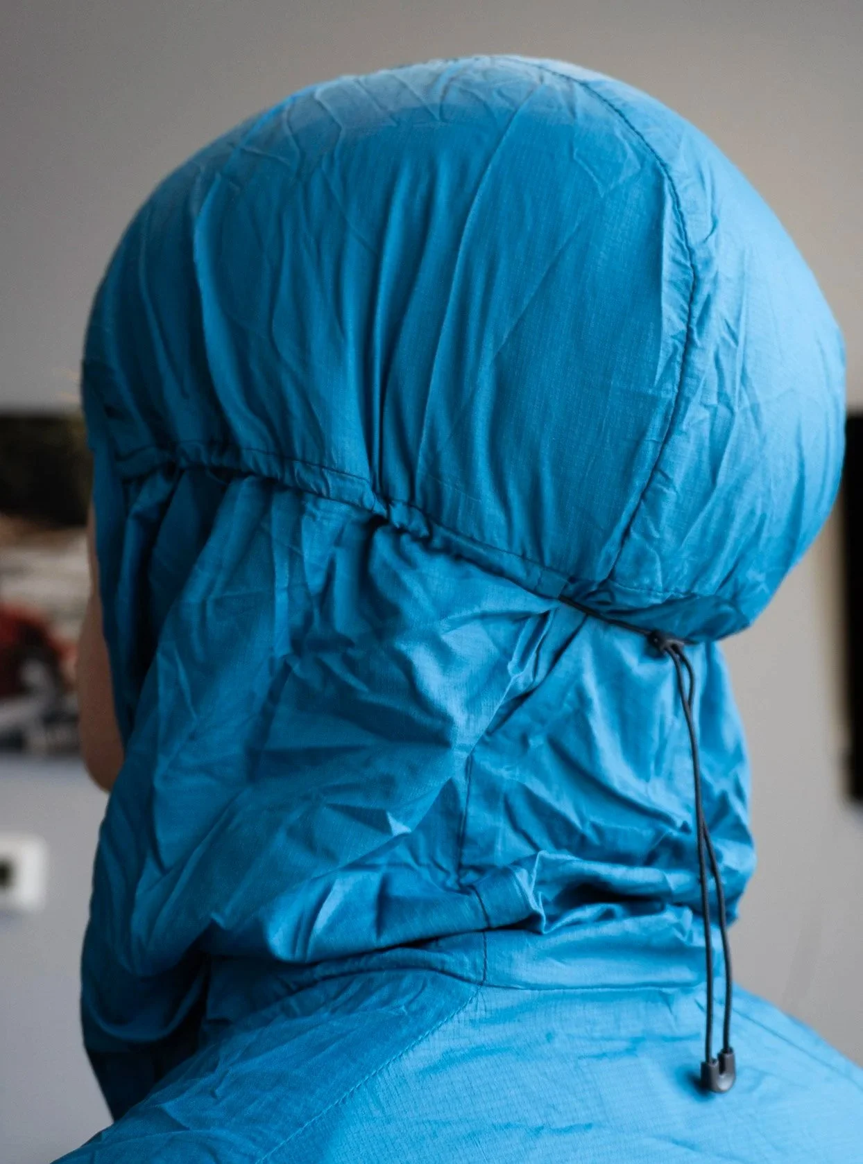 The fit also makes sense for what this jacket is trying to be. Janji calls it a regular, athletic fit, and that tracks. It has enough room to move well and layer over a light top without feeling boxy or floppy. The bungee hem and hood toggle help clean things up when the wind picks up, which is useful because a jacket this light can feel a little loose and fluttery if the fit is not easy to dial.