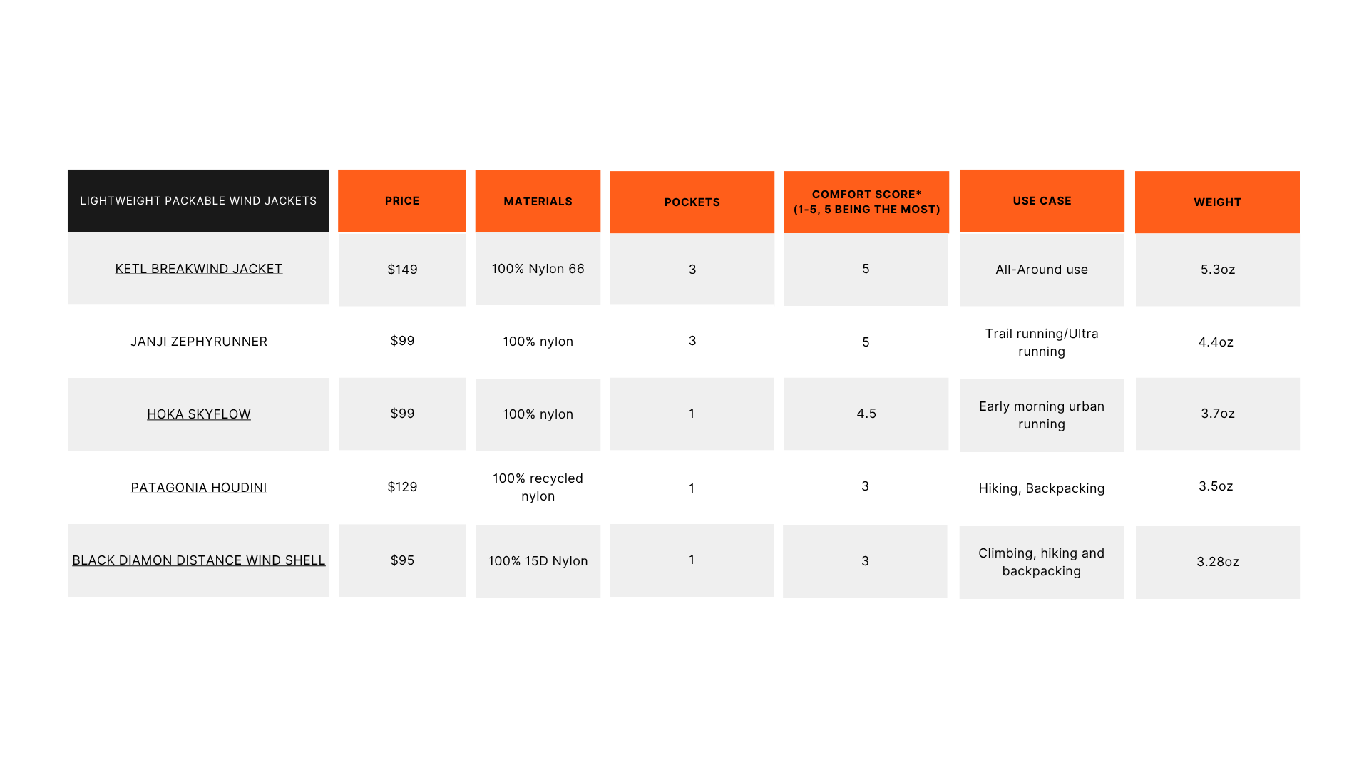 Some of these are at their best in a pretty narrow lane. The HOKA Skyflow is great for breezy morning runs. The Janji Zephyrunner is the strongest running-specific jacket in the group. The Patagonia Houdini still makes a ton of sense as a tiny just-in-case shell for hiking, backpacking, and travel. And the Black Diamond Distance Wind Shell feels the most mountain-specific, especially for hiking, scrambling, and fast-and-light days where protection matters more than venting. The KETL Breakwind jacket was not the lightest or the most specialized, but it kept making the most sense on the widest range of days.